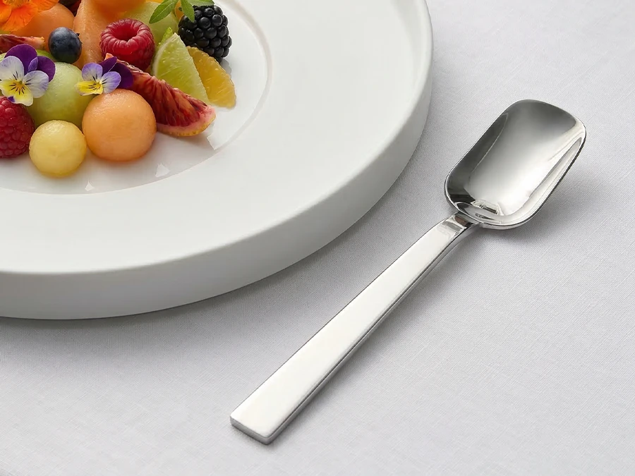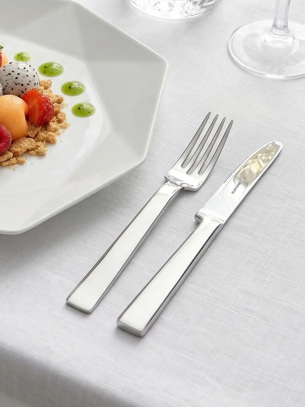 Laquadra è precisione trasformata in design. Le sue geometrie nette superano la tradizione e danno alla tavola un linguaggio nuovo: più deciso, più autentico. Al tatto il metallo restituisce solidità ed equilibrio, mentre la conformazione originale della tazza sorprende e introduce una nuova consistenza.